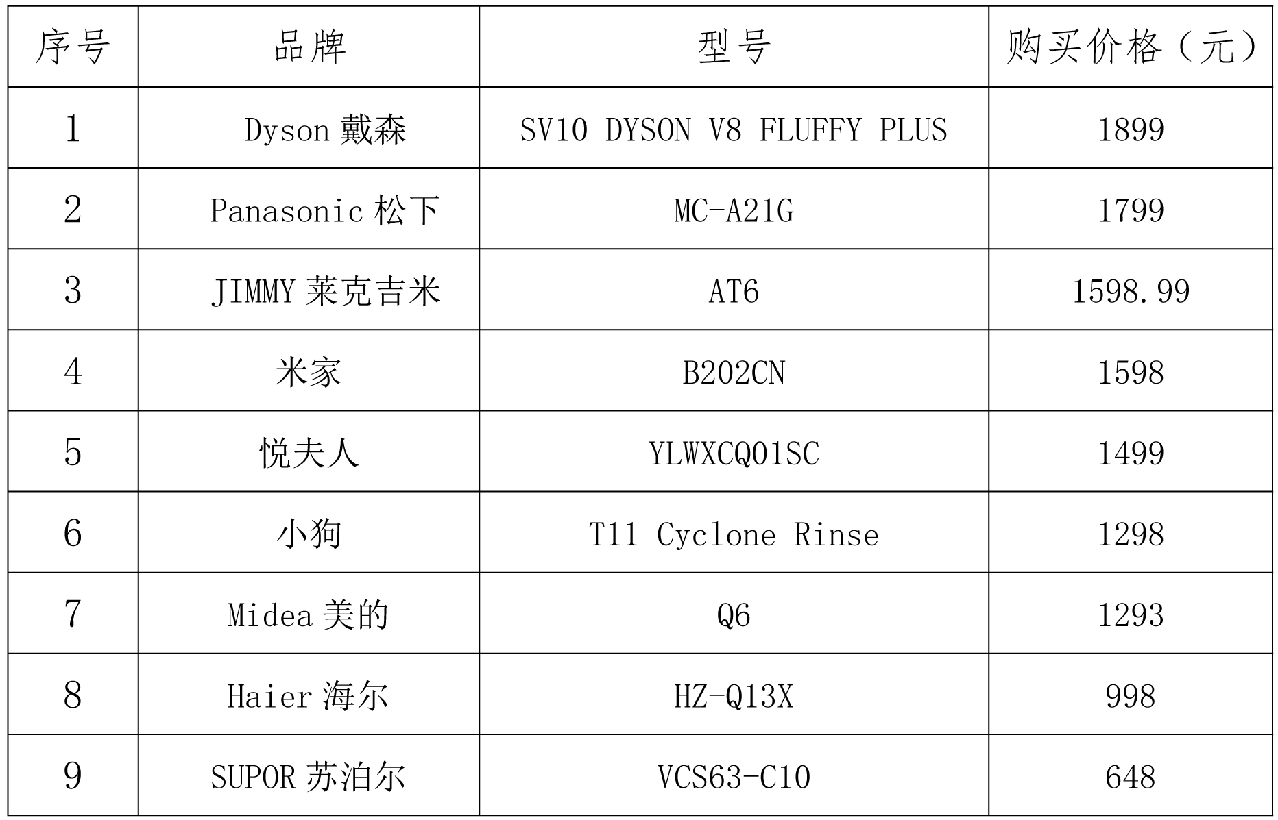 比较试验样品由工作人员以普通消费者的身份从电商平台购买了9个品牌的9套样品。购买价格范围从648元/台到1899元/台不等。